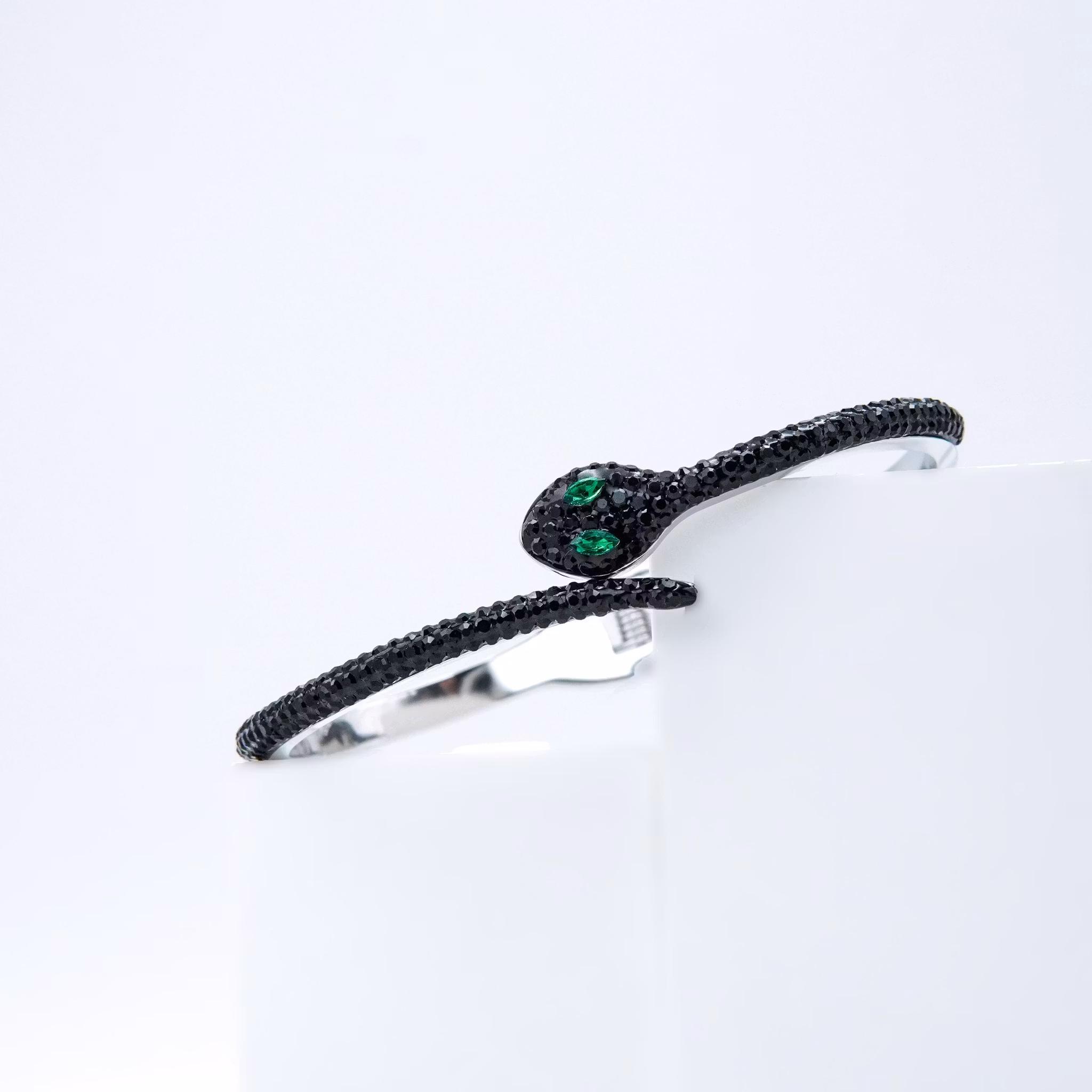 Py-thone Black Grace - Black Diamond Mode Armband Dam från SWEVALI är tidlöst modernt armband som drar till sig all uppmärksamhet. Gillar du synas? Det gör denna fantastiska armband med! Otroligt vacker med sina svarta glittriga detaljer och lyxiga gröna ögon. Den sticker ut ur mängden!