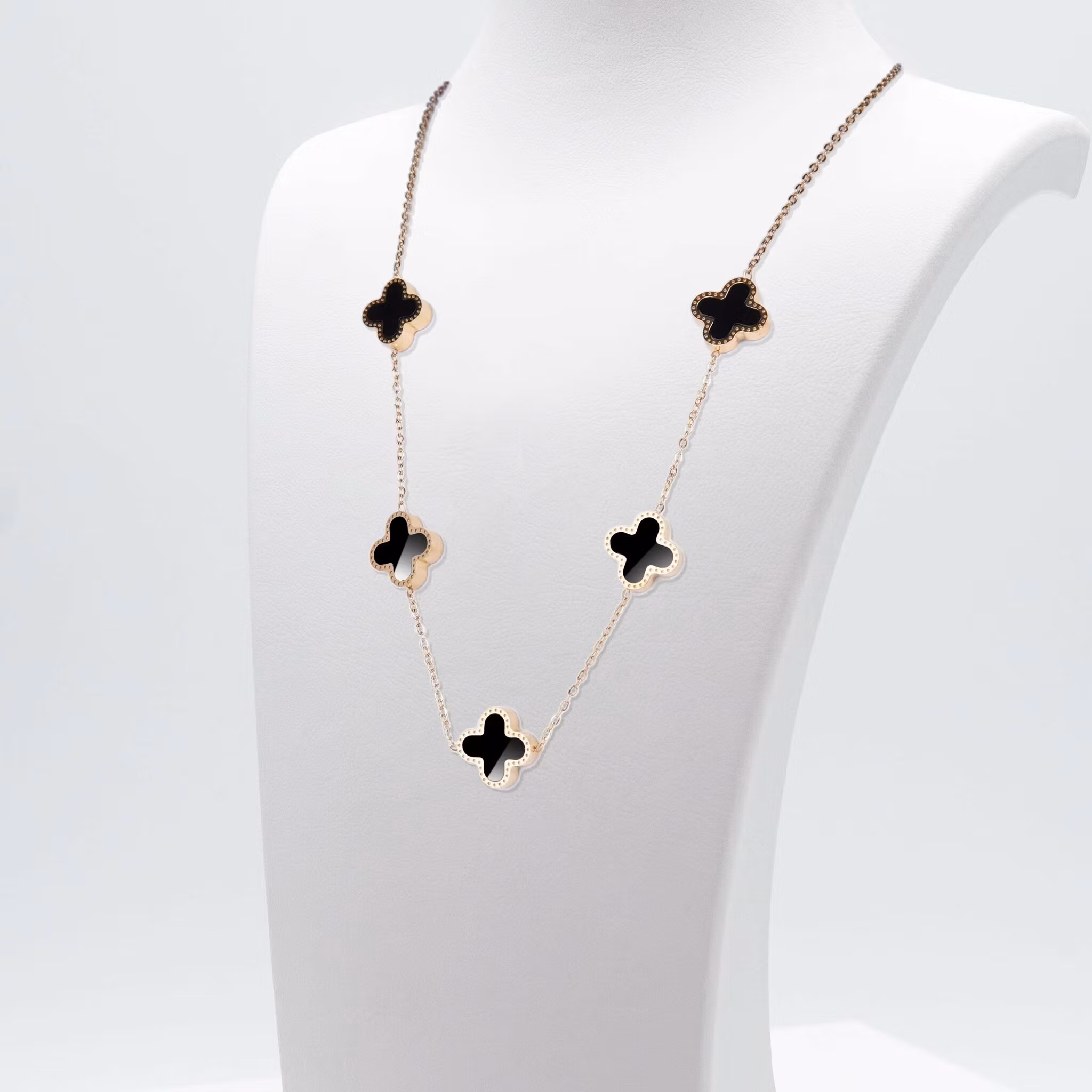 Clover Summer - Gold Edition Halsband Dam från SWEVALI är ett tidlöst och charmigt halsband som består av en tunn elegant kedja med fem vackra fyrklöver, ett symbol som ofta associeras med tur och de fyra bladen som står för tro, hopp, kärlek och lycka.