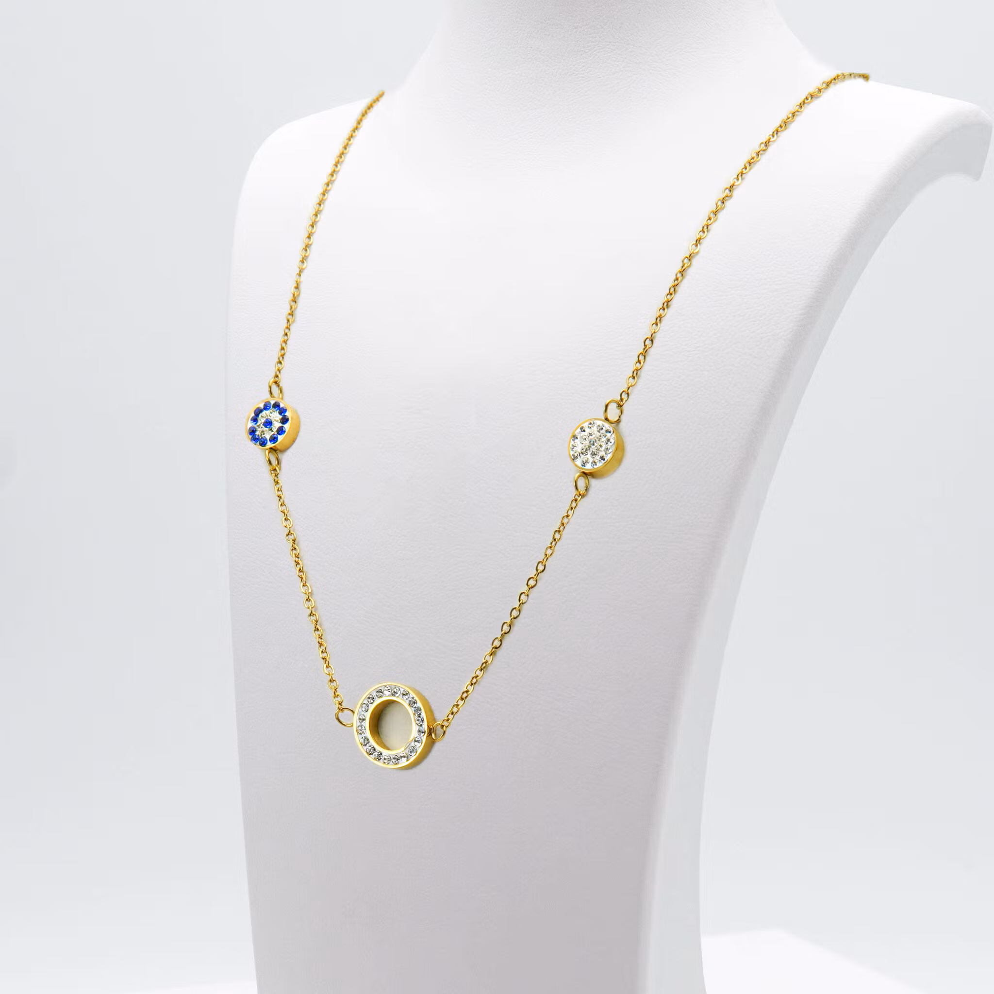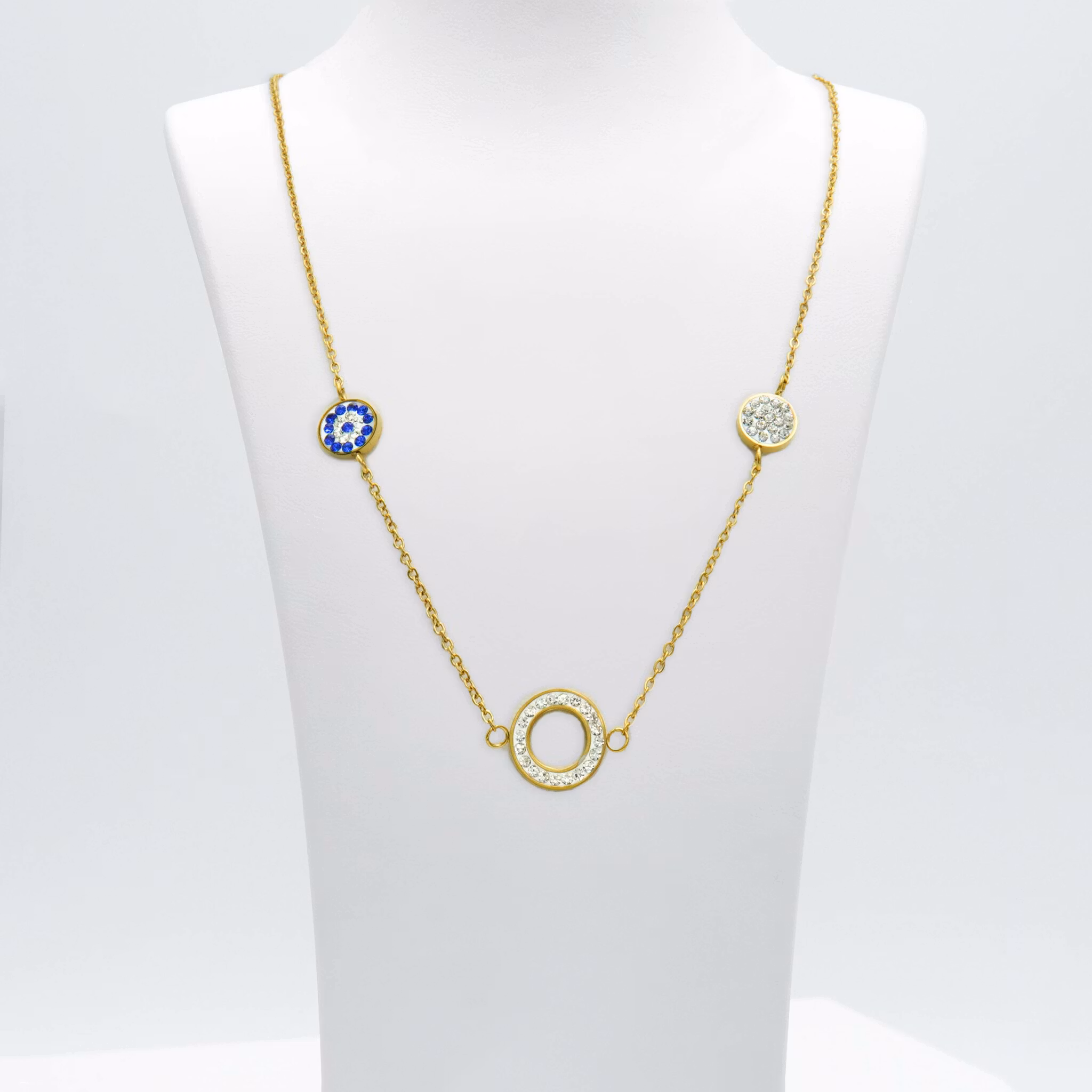 Du möts av en halsband rik av detaljer, tre cirklar som inte lik varandra. Cirkel som kommer att sitta på din högra sida är en färgglad motiv med många små diamanter (strass) i kombination med blåa zirconium stenar, otroligt snyggt. Cirkel till vänster är fylld av diamanter (strass) och lyser upp halsbandet i solen. I mitten hänger ett vackert stor cirkel med massa diamanter (strass) runt om. Otroligt vacker halsband som passar perfekt med en snygg outfit!